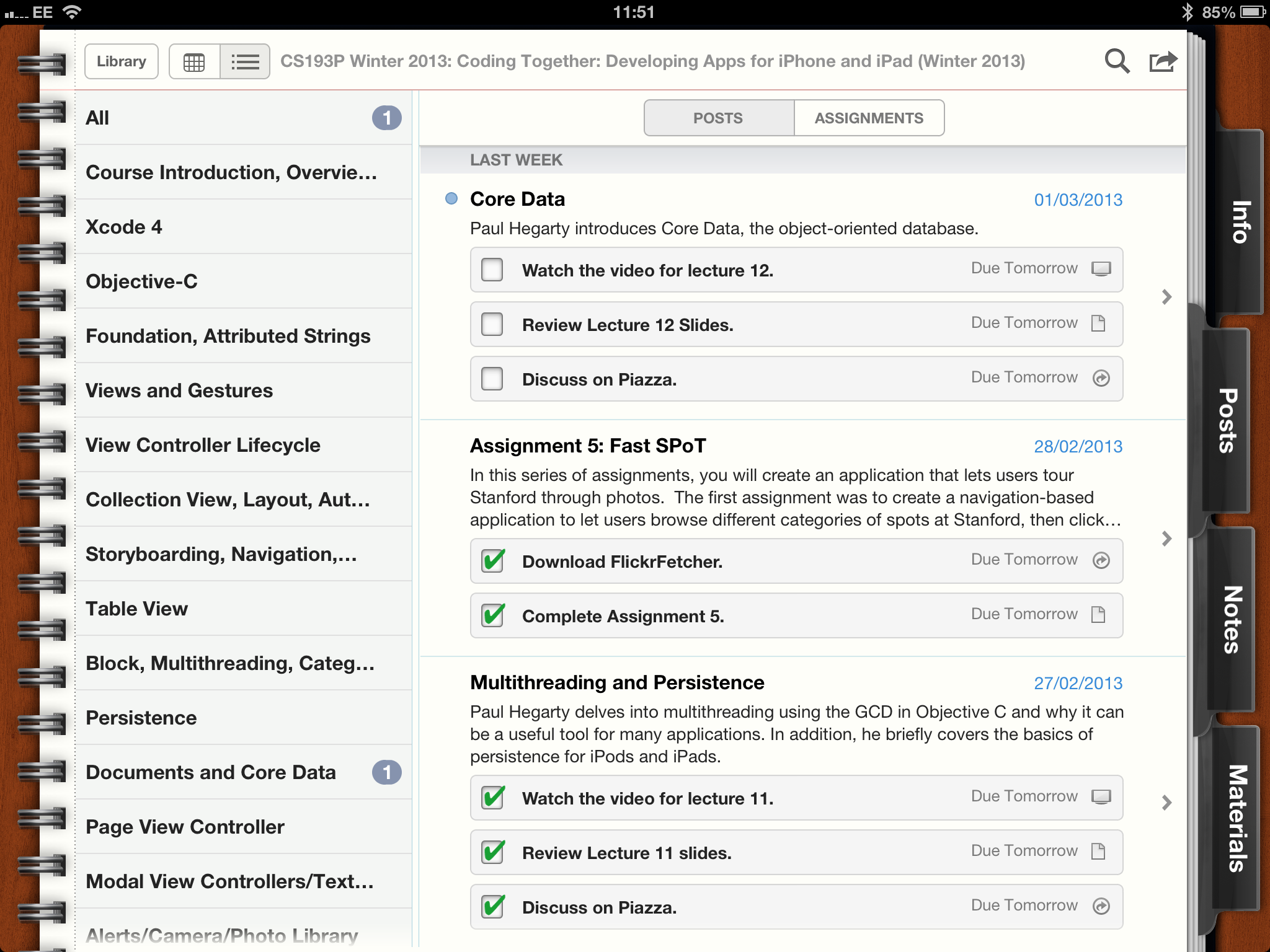 For the past two months I have been following a course in iOS programming from the Stanford university. It’s called “CS193P Winter 2013: Coding Together: Developing Apps for iPhone and iPad” and is brilliant. As the name suggests, it’s the actual course being taught now at Stanford and is posted with approximately 1 week delay from the actual course. It feels very much like being in the class. Actually even better because if I missed something I can rewind and listen to that part again. And if something really important pops up I can pause and restart when I can focus back on the course itself. Add to that a vibrant community of virtual students that exchange Q&A on the associated Piazza and you got all the ingredients of a very successful experience. All that for free…