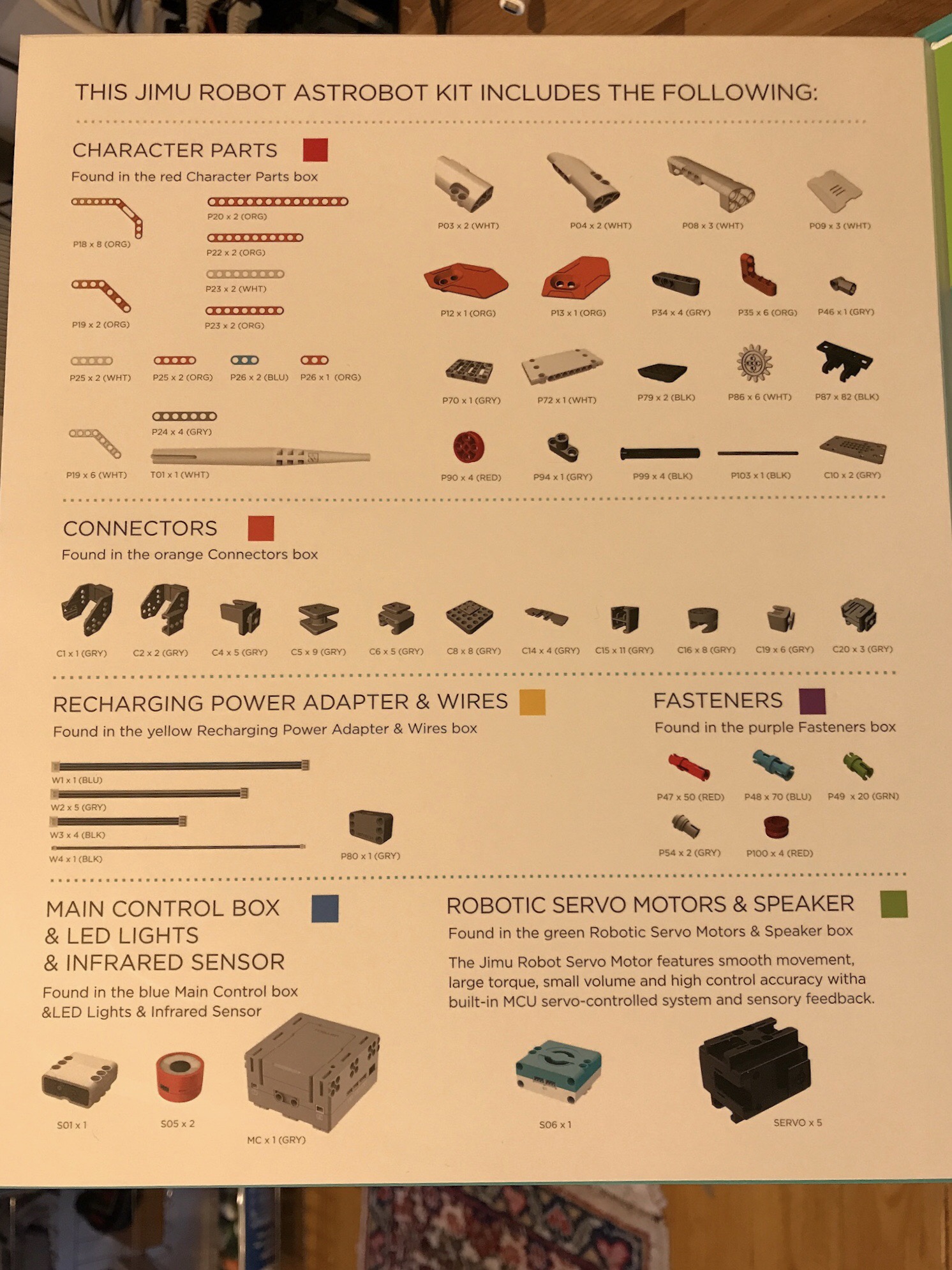 On the inside flap there is an inventory of the items included in the kit (couriously enough this information is not accessible on the website when looking at the kits, something surely UBTECH should consider to include in the future; so please have a look on the picture bellow if you’re interested to know what’s included in this kit):