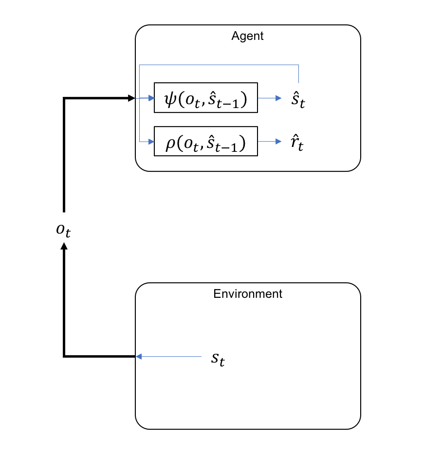 Here we used the state estimate from the previous time step to indicate that the determination of the reward and the re-evaluation of the state happen simultaneously, although it is also possible to represent them as part of a pipeline process, being produced sequentially. To stay consistent with the rest of notations I also used the hat for the value of reward, indicating the fact that it is an estimate (the Agent’s expectation of reward).